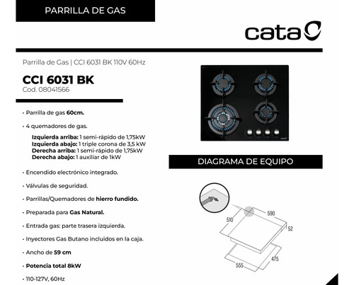 Con dimensiones compactas que facilitan su instalación, la Parrilla CATA se transforma en una gran adición a cualquier cocina moderna sin sacrificar el estilo ni la funcionalidad. Potente, segura y elegante, es el complemento perfecto para aquellos que buscan una experiencia gastronómica superior en el hogar.