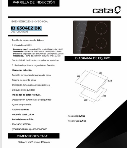 Parrilla Inducción Europea Cata 4 Quemadores Cristal Ng 220v