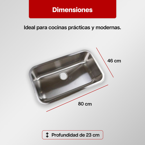 Con unas dimensiones de 80 cm de largo y 46 cm de ancho, ofrece un amplio espacio para el lavado de utensilios y alimentos. Su profundidad de 23 cm permite una mayor capacidad, facilitando las tareas diarias en la cocina. Además, su instalación submontar proporciona un aspecto limpio y moderno, integrándose perfectamente con la encimera.